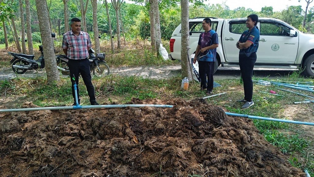 นายภควัตร วิจิตรไพโรจน์ Young Smart Farmer ปี พ.ศ. 2567 (เจ้าของสวนไร่องุ่น 2 เล) นายวิโรจน์ หนูคำสวน เกษตรกรผู้ปลุกทุเรียน และนักศึกษาฝึกงานจากวิทยาลัยเกษตรและเทคโนโลยีนราธิวาส มหาวิทยาลัยนราธิวาสราชนครินทร์ ที่เข้ามาฝึกงาน ณ ไร่องุ่น 2 เล ร่วมทำปุ๋ยหมัก เป็นปุ๋ยหมักแม่โจ้แบบไม่กลับกอง สูตรวิศวกรรมแม่โจ้1 โดยใช้วัสดุการเกษตร คือ ทะลายปาล์มน้ำมัน
