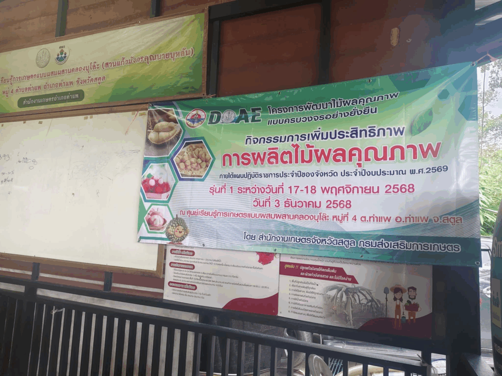 ระหว่างวันที่ 17-18 พฤศจิกายน 2568 นายอารีย์ โส๊สันสะ เกษตรอำเภอท่าแพ เจ้าหน้าที่สำนักงานเกษตรอำเภอท่าแพ ร่วมกับเจ้าหน้าที่กลุ่มส่งเสริมและพัฒนาการผลิต สำนักงานเกษตรจังหวัดสตูล จัดกิจกรรมอบรมโครงการพัฒนาไม้ผลคุณภาพแบบครบวงจรอย่างยั่งยืน กิจกรรมการเพิ่มประสิทธิภาพการผลิตไม้ผลคุณภาพ ณ เครือข่ายศูนย์เรียนรู้การเพิ่มประสิทธิภาพการผลิตสินค้าเกษตร การเกษตรแบบผสมผสานคลองบุโล๊ะ หมู่ที่ 4 ตำบลท่าแพ อำเภอท่าแพ จังหวัดสตูล